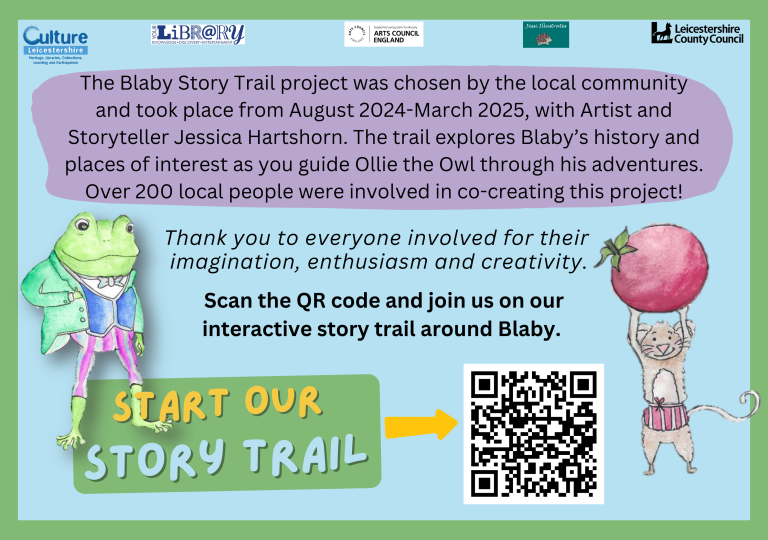 The Blaby Story Trail project was an exciting community project that took place from August 2024-March 2025, with Artist and Storyteller Jessica Hartshorn. The trail explores Blaby’s history and places of interest as you guide Ollie the Owl through his adventures.