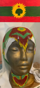 “For me this is really special because I designed it with the colours of my Oromo flag. This is the flag for my people in Ethiopia. It symbolises freedom and identity. If you fly this flag in Ethiopia it can be very dangerous and you can go to prison or even worse because we are fighting for independence. That is why I designed this headdress and necklace as a protest. Usually we would wear traditional jewellery like this in our culture when we get married or there is a BIG celebration or very special occasion.”