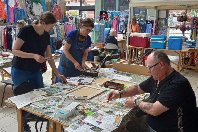 We appointed Amy Nicholson of Handmade Theatre, to lead a creative response to the exhibition. This June and July Amy ran workshops in the market, museum and at Robert Smyth Academy. Engaging with approximately 250 people Amy and her colleague, Suzy Gunn used their ideas, inspiration, photos and stories to create the concepts for the mural. People also took part in painting, printing and collage.